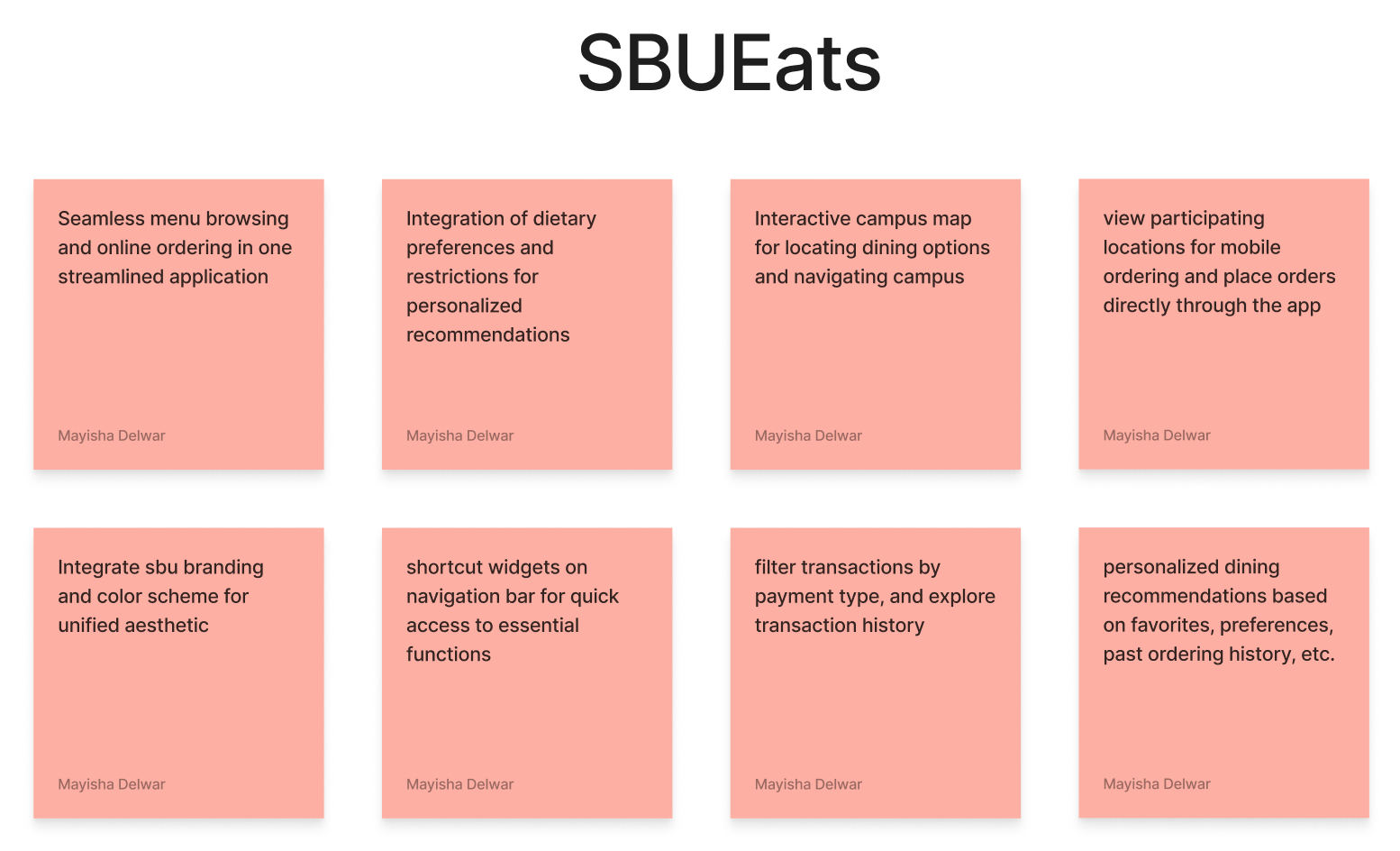 During brainstorming sessions, I generated ideas for potential features and functionalities that would make SBUEats a comprehensive and user-friendly platform. These ideas include seamless menu browsing, integration of dietary preferences, interactive campus map, mobile ordering, SBU branding, quick access widgets, transaction filtering, personalized dining recommendations, and more.