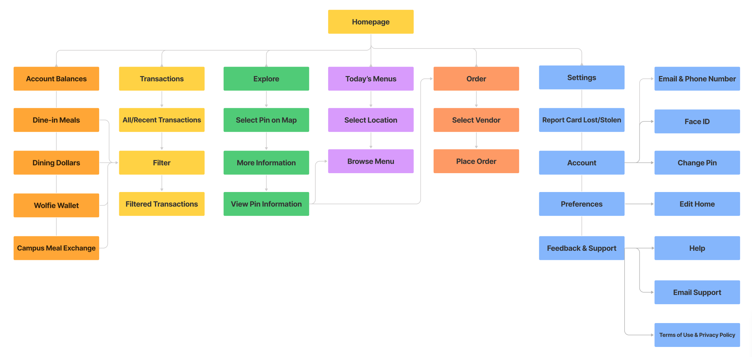 To ensure seamless navigation and user interaction, I crafted a user flow diagram that maps out the main features and functions of SBUEats. This diagram visualizes the user journey and highlights key touchpoints within the app, facilitating efficient navigation without confusion.
