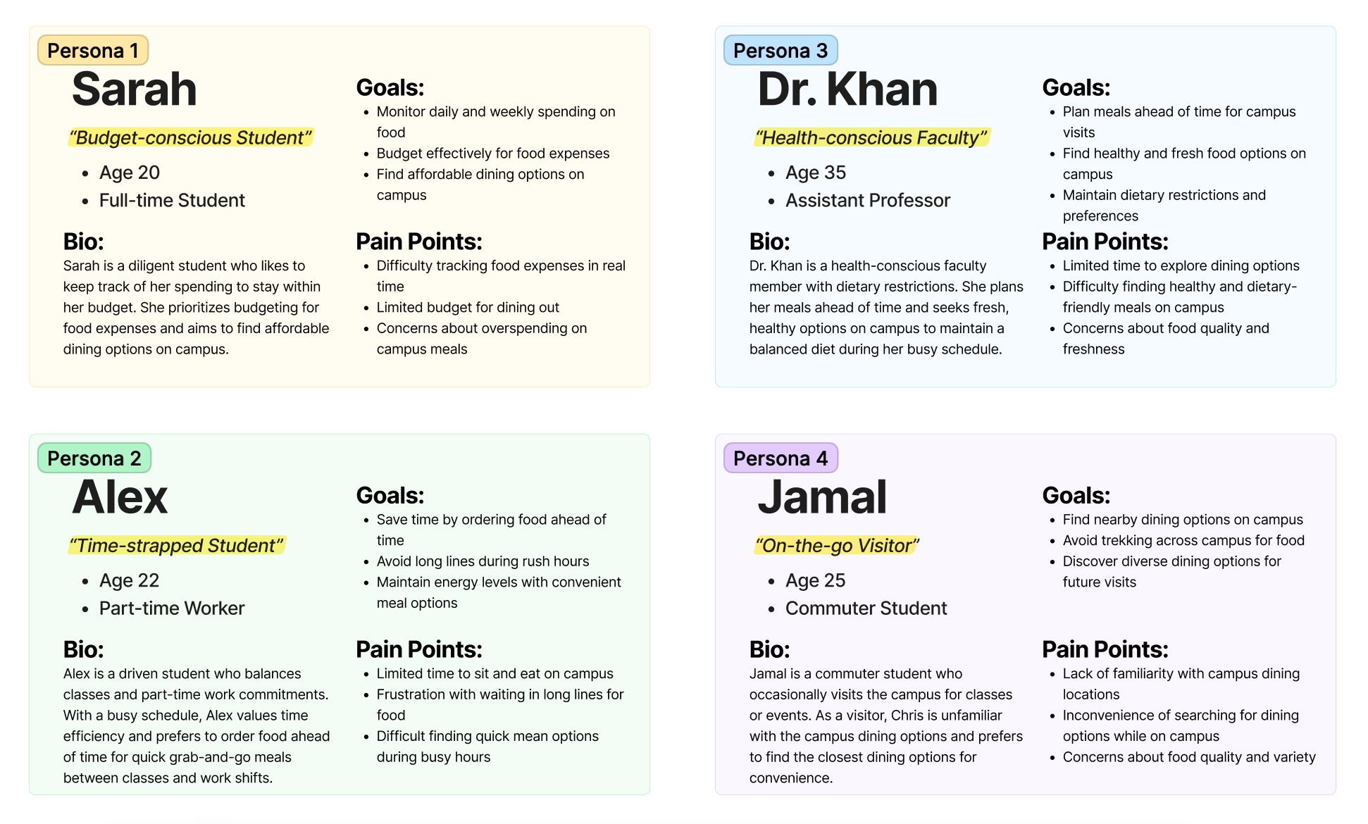 Drawing from my research insights, I developed user personas to represent the diverse needs and preferences of the SBU community. These personas provided valuable insights into the specific challenges faced by different user groups, including students balancing budget constraints, faculty with dietary restrictions, and visitors seeking convenient dining options on campus.